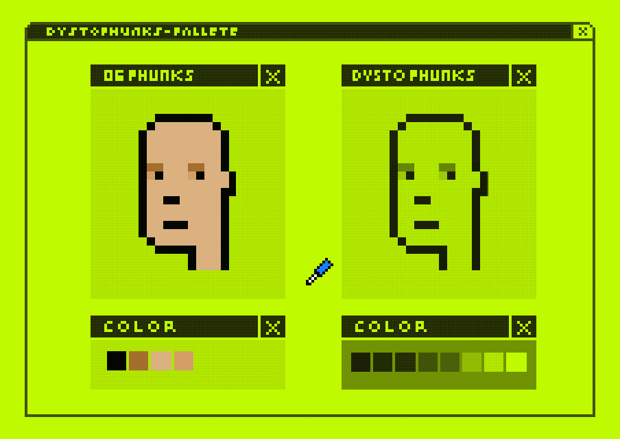 It's a black with dark green tone, we can see the HEX code: #0d1b01 for Dystophunks. while OG Phunks have HEX code: #000000