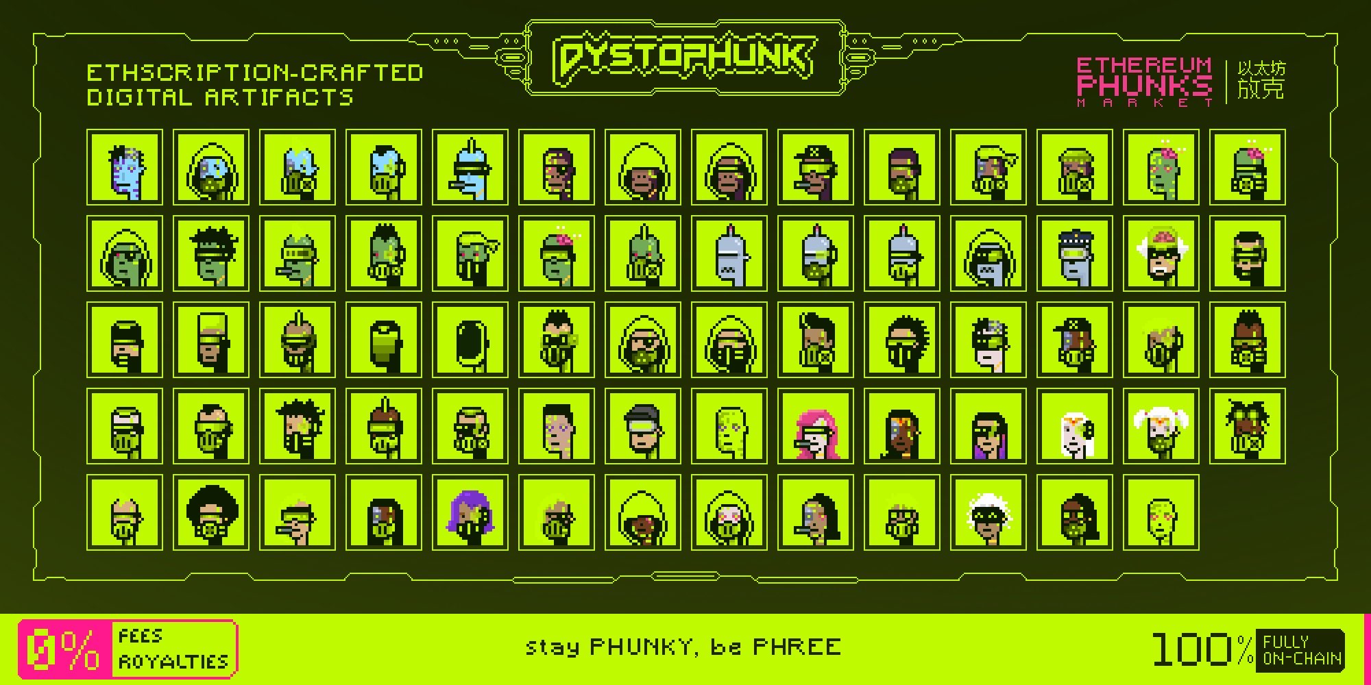 Dystophunks are minted and stored on-chain, using etherscribe. They are digital artifacts created by Ethscription on the ETH blockchain