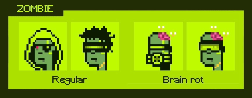 There are two types of zombies and one is characterized by brain rot with flies, part of the brain comes out on the left side of the head.